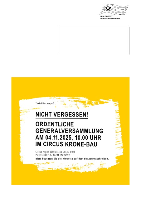 Taxi-München eG NICHT VERGESSEN! ORDENTLICHE GENERALVERSAMMLUNG AM 04.11.2025, 10.00 UHR IM CIRCUS KRONE-BAU Circus Krone (Einlass ab 08.30 Uhr) Marsstraße 43, 80335 München Bitte beachten Sie die Hinweise auf dem Einladungsschreiben.